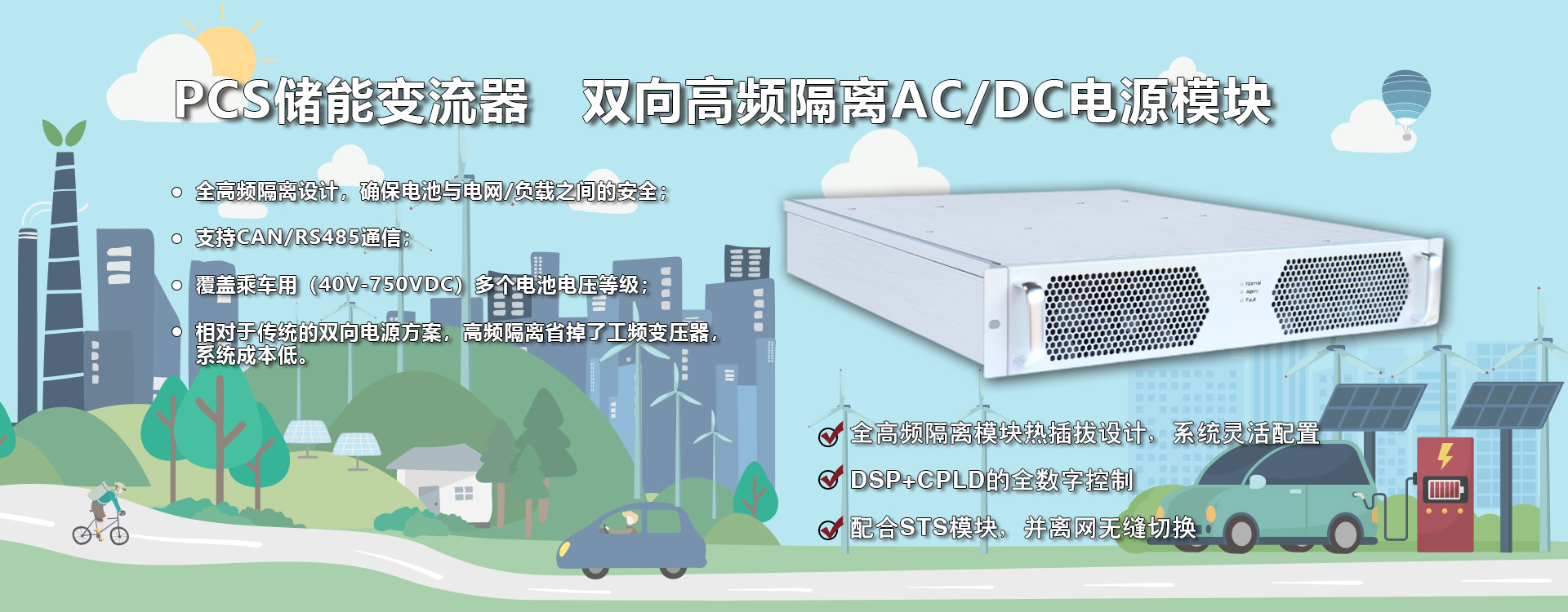 模塊化儲能變流器,用V2G高頻隔離模塊構建而成,兼有高頻隔離與模塊化的優點,機柜兼容IBG75027與IBG30050模塊,根據需求靈活配置成不同功率等級與不同電池電壓的儲能變流器。